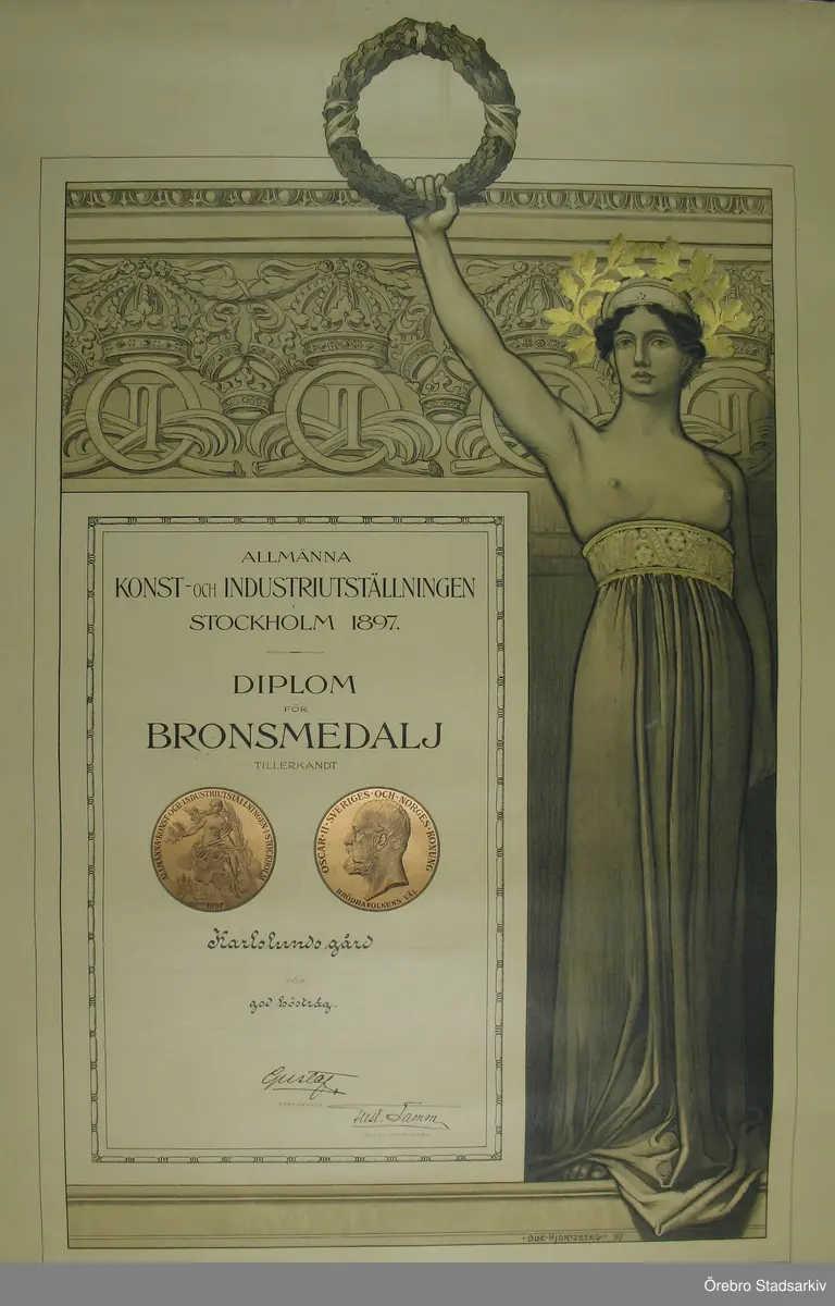 Diplom för bronsmedalj för god höstråg till Karlslunds gård, 1897