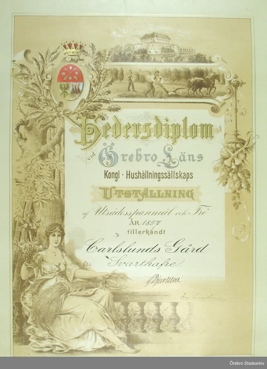 Hedersdiplom till Carlslunds gård för Svarthavre, 1897