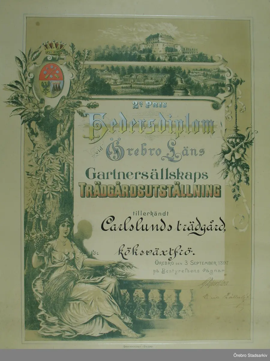 2:a pris hedersdiplom till Carlslunds trädgård för köksväxtfrö, 1897-09-03