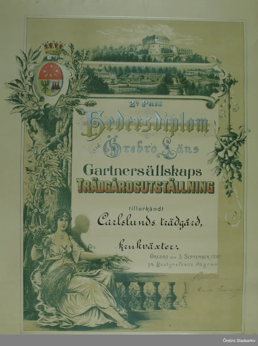 2:a pris, hedersdiplom till Carlslunds trädgård för krukväxter, 1897-09-03