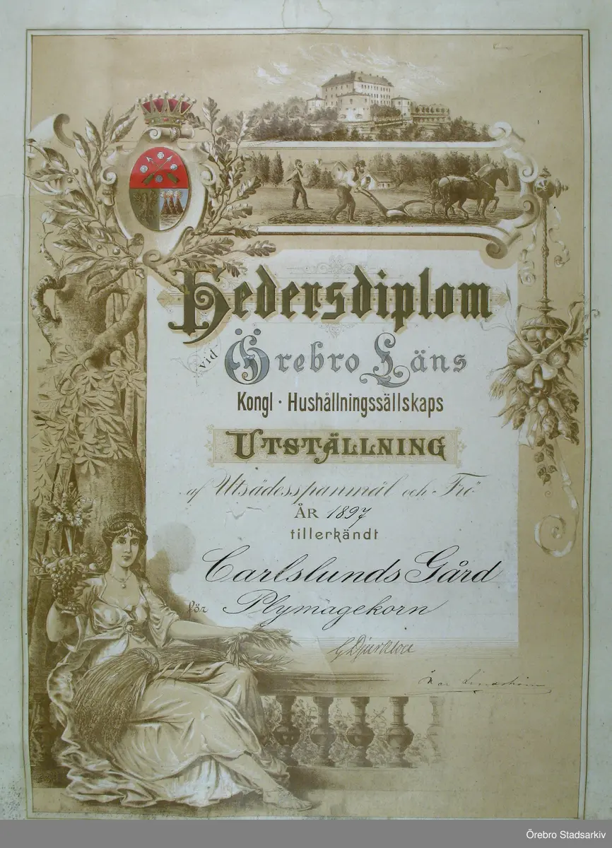 Hedersdiplom tillerkänt Carlslunds gård för Plymagekorn, 1897