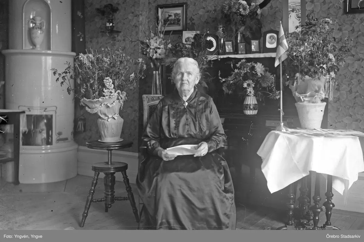 Kvinna fotograferad i hemmet på högtidsdagen, 1920-tal