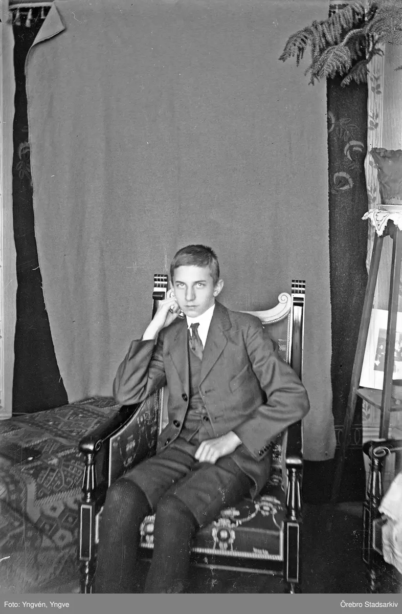 Ung man sitter i en stol framför ett övertäckt draperi, 1920-tal