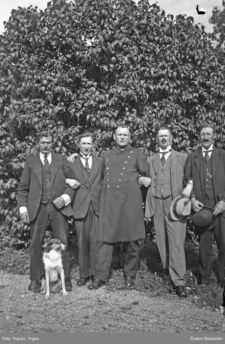 Fem män i kostym och uniform med hund samlade i en park, 1920-tal