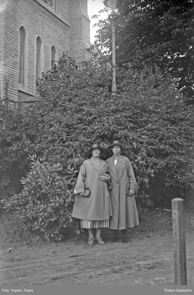 Två kvinnor utanför Olaus Petri-kyrkan i Örebro, 1920-tal