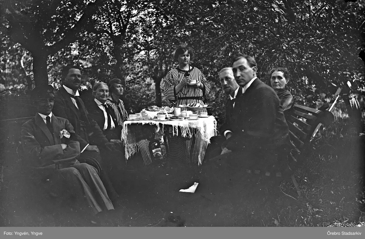 Samlade runt ett dukat kaffebord i bersån, 1920-tal