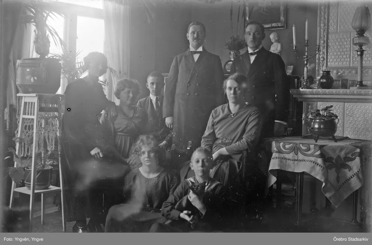 Solen strömmar in genom fönster bakom familjegrupp i hemmet, 1920-tal