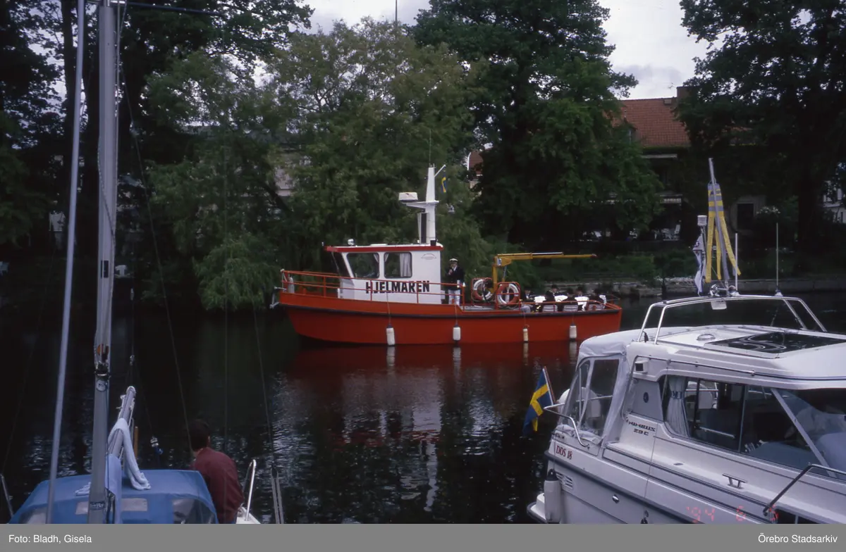 Båten Hjelmaren och två mindre båtar förtöjda vid kaj i Svartån på Båtens dag, 1994-06-03