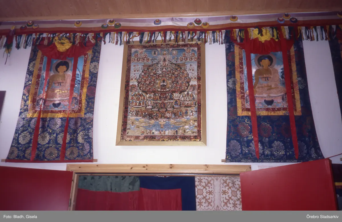 Gobeläng med motiv av Buddha i tempelrummet på Buddistiska kursgården i Fellingsbro, 1991