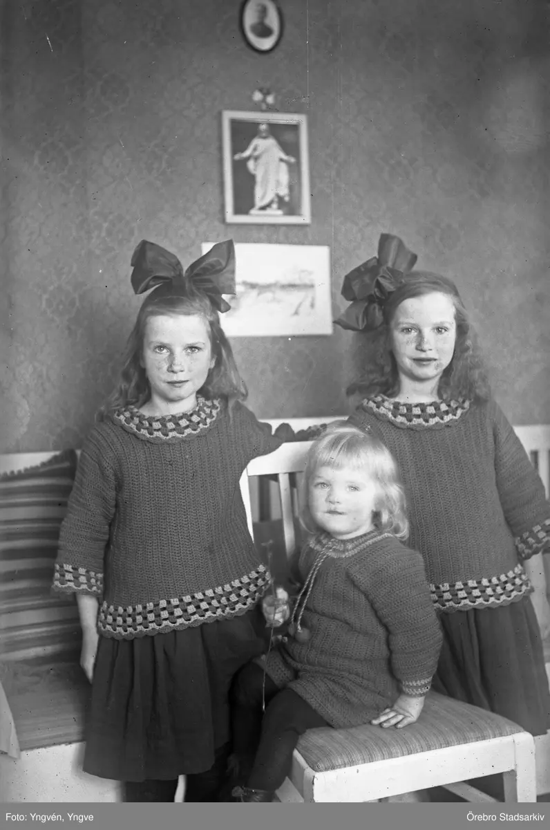 Porträtt av tre barn i stickade kläder, 1920-tal