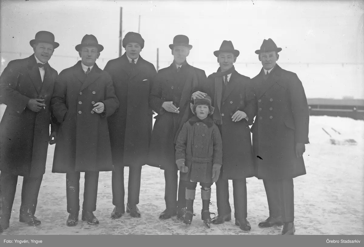 Sex män och en pojke poserar på isen framför kameran, 1920-tal