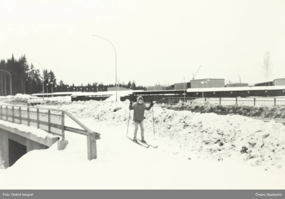 Skidåkning över gångbro i Vivalla, 1970-tal
