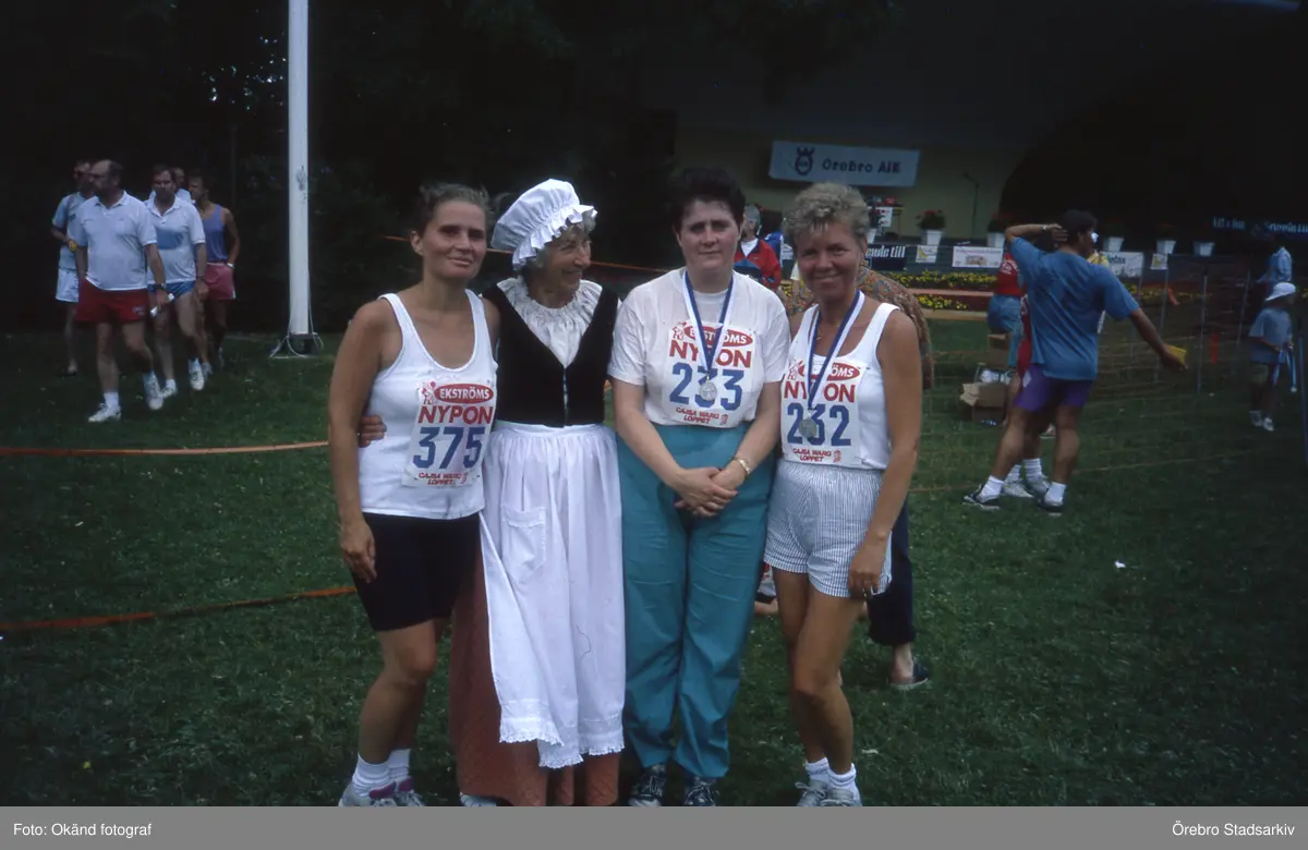 Gisela Bladh kramar de tre vinnarna i Cajsa Warg loppet efter prisutdelningen i Stadsparken, 1992