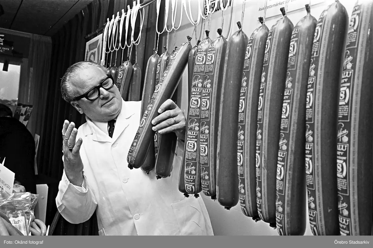 Direktör Westerberg visar falukorv för pressen på Scan i Ormesta, 1970-tal