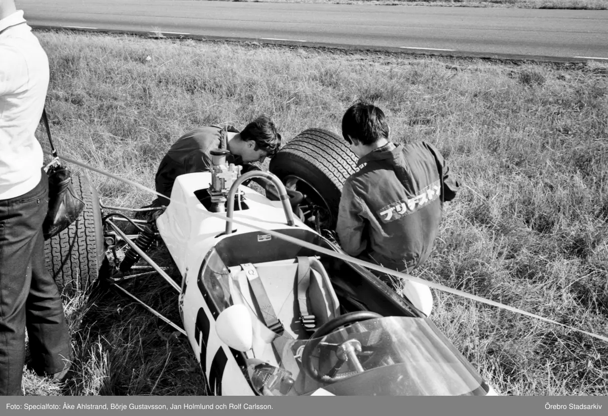 Brabham med hjulproblem på Kanonloppet i Karlskoga. 1968-08-11