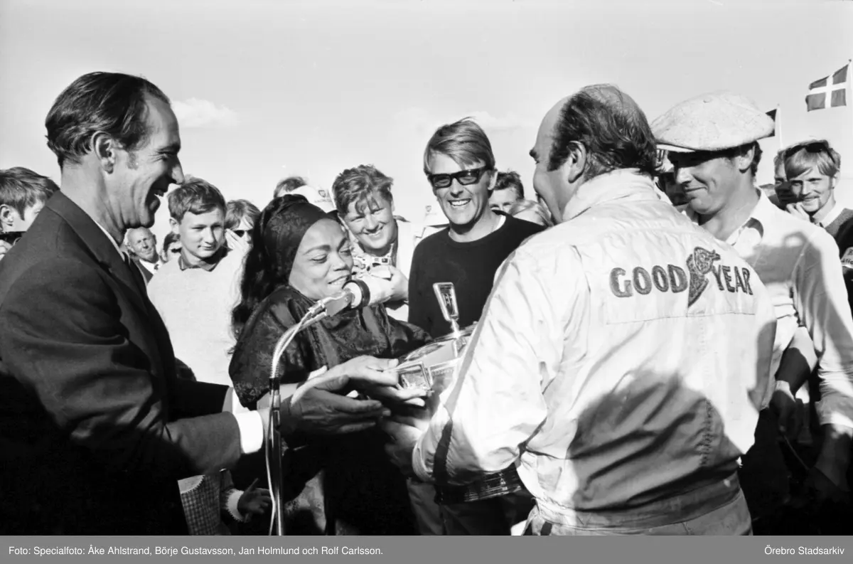 Eartha Kitt överlämnar segerbucklan på Kanonloppet i Karlskoga. 1968-08-11
