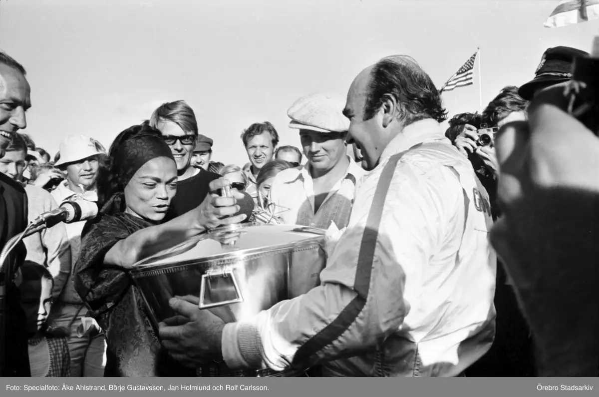 Eartha Kitt överlämnar segerbucklan på Kanonloppet i Karlskoga, 1968-08-11