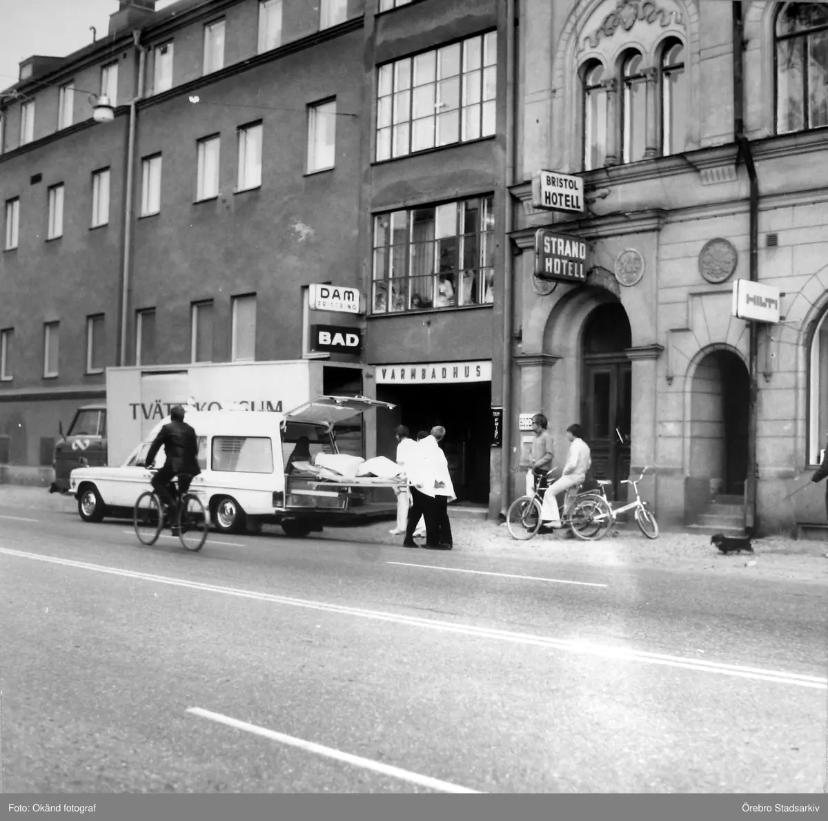 Ambulansutryckning utanför varmbadhuset, 1970-tal