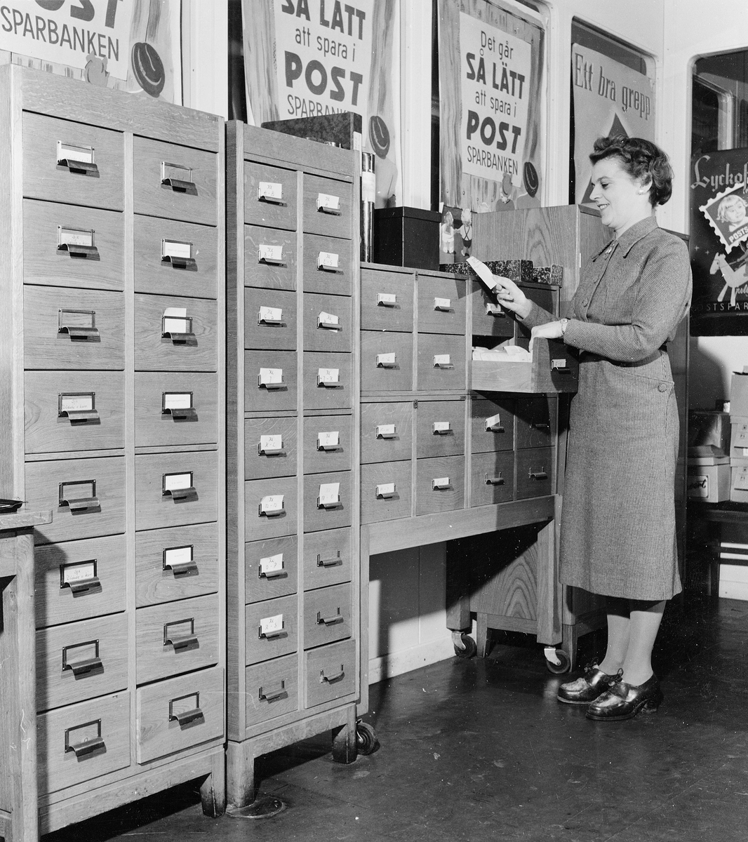 Fru Ann-Britt Stennert söker i kortlådorna.