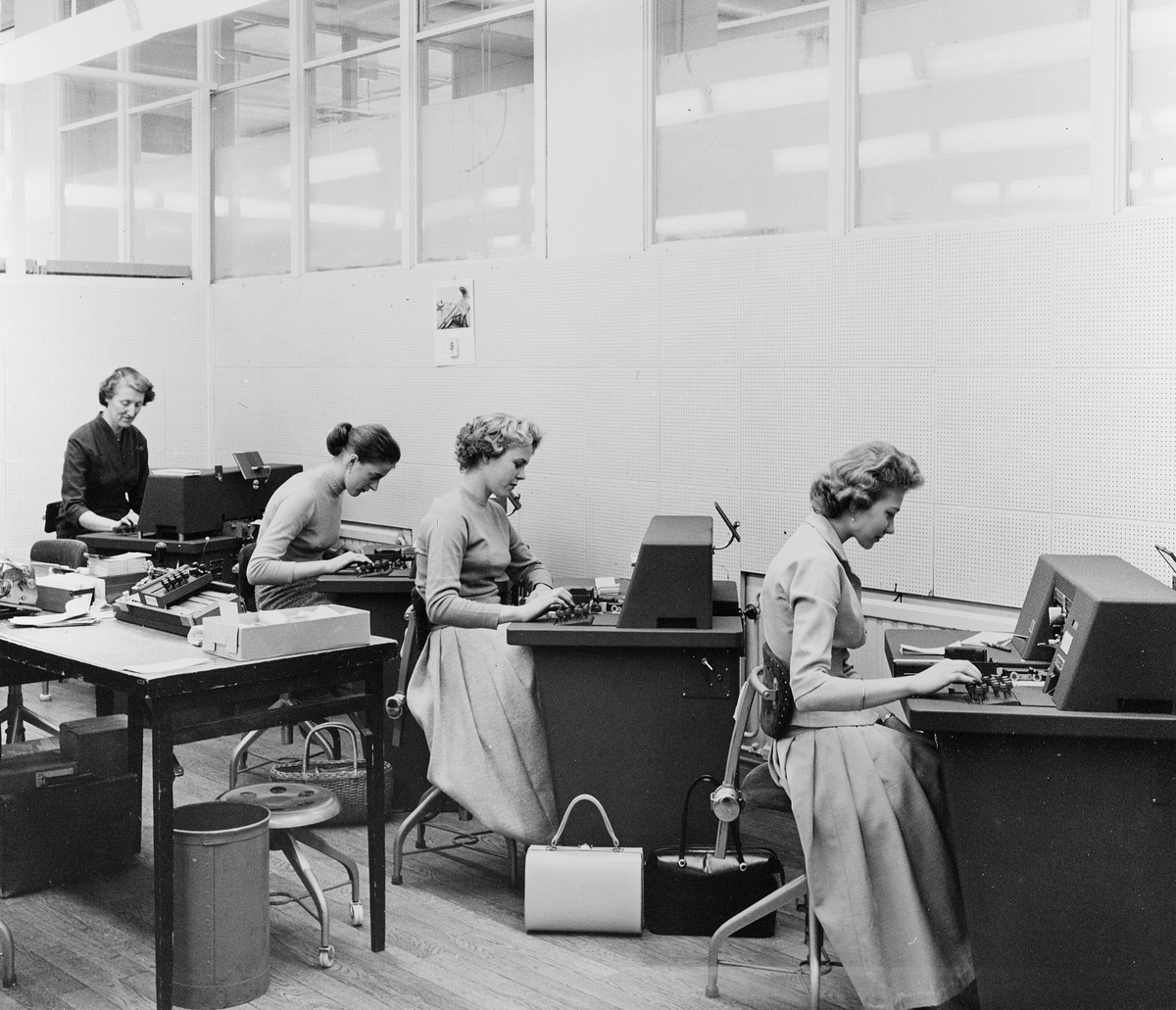 Stansning av missivkort till hålkorts- och kassautredningen. Powers 80-kolumners stansningsmaskiner.