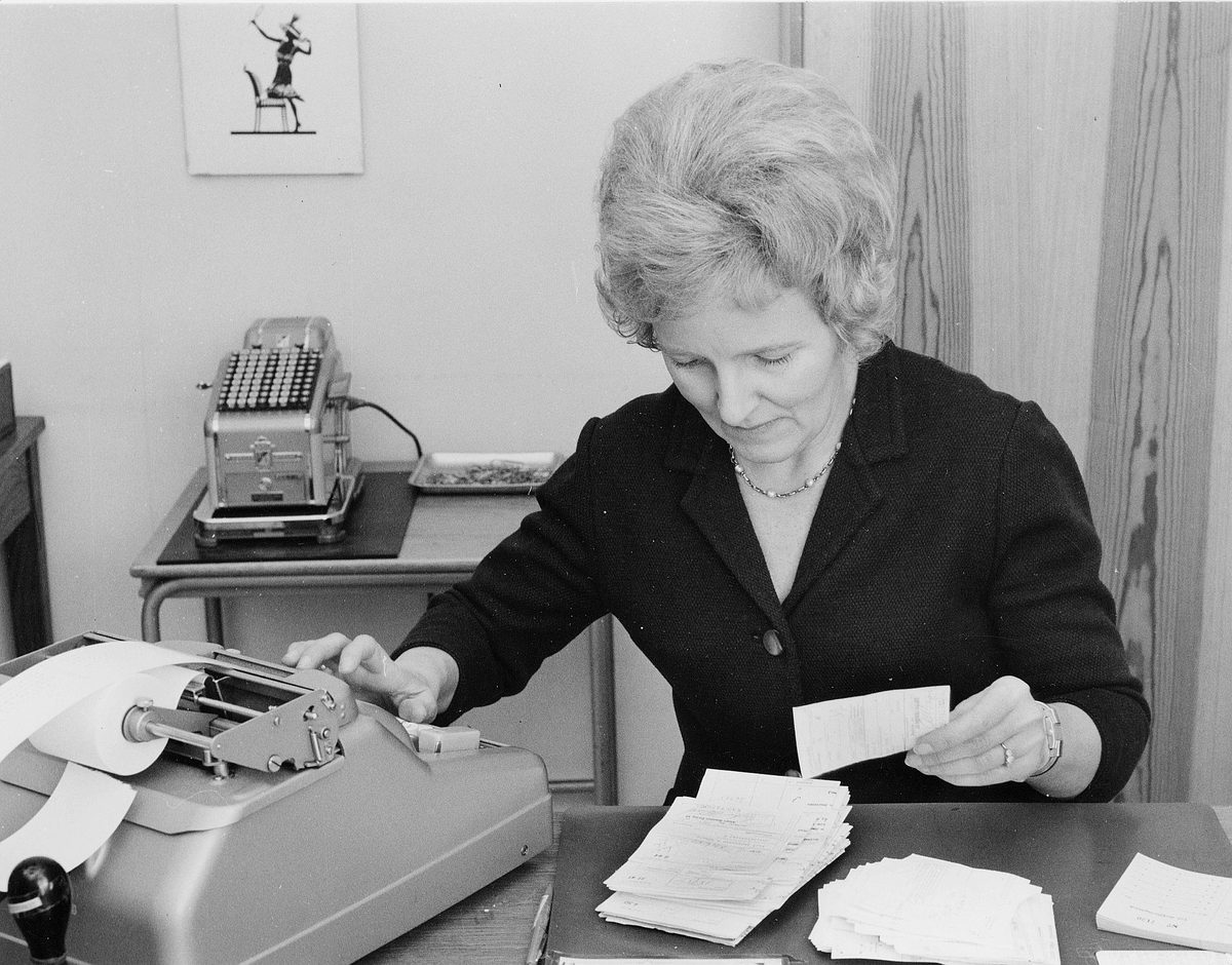 Titel: Maskinräkning vid för högt placerat tangentbord. Genom utåt - uppåtlyftningen av höger överarm, och därmed ett engagemang av vänster skuldergördels muskulatur, söker yrkesutövaren kompensera en för högt placerad arbetsyta.