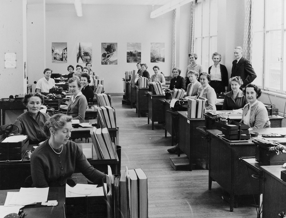 Korrespondensavdelningen på 1 trappa. Postgirohuset, Stockholm. Till höger, vid fönstret, står chefen för avdelningen, förste byråsekreterare Perling. Fönster åt Mäster Samuelsgatan.