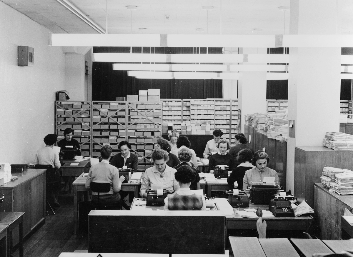 Postgirokontorets Undersökningsavdelning på nedre botten. I fonden girots närliggande arkiv (tre dagars liggetid). Här utfärdas omkring 5500 kontokuranter per månad.