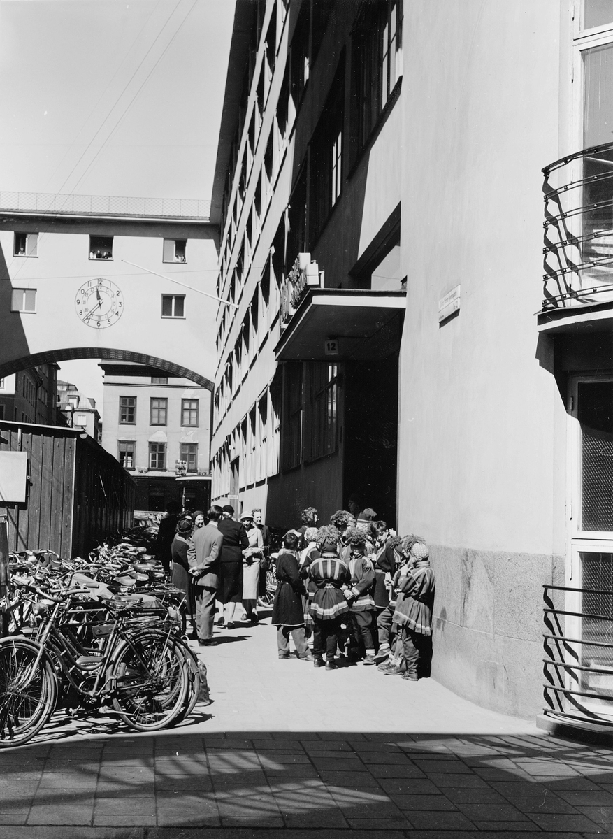 En grupp samebarn från Jokkmokk, samlade utanför porten, skall
