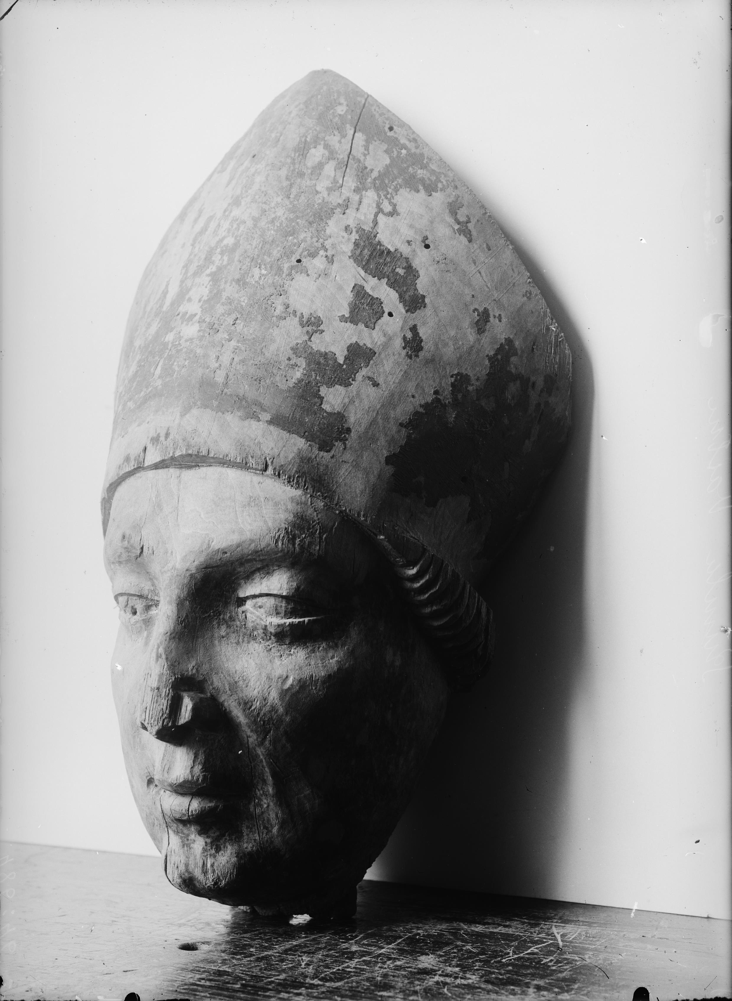 Beskrivning: Medeltida biskopshuvud. Mitran lågt över pannan. Huvudet har utförts i två halvor, nackpartiet saknas.