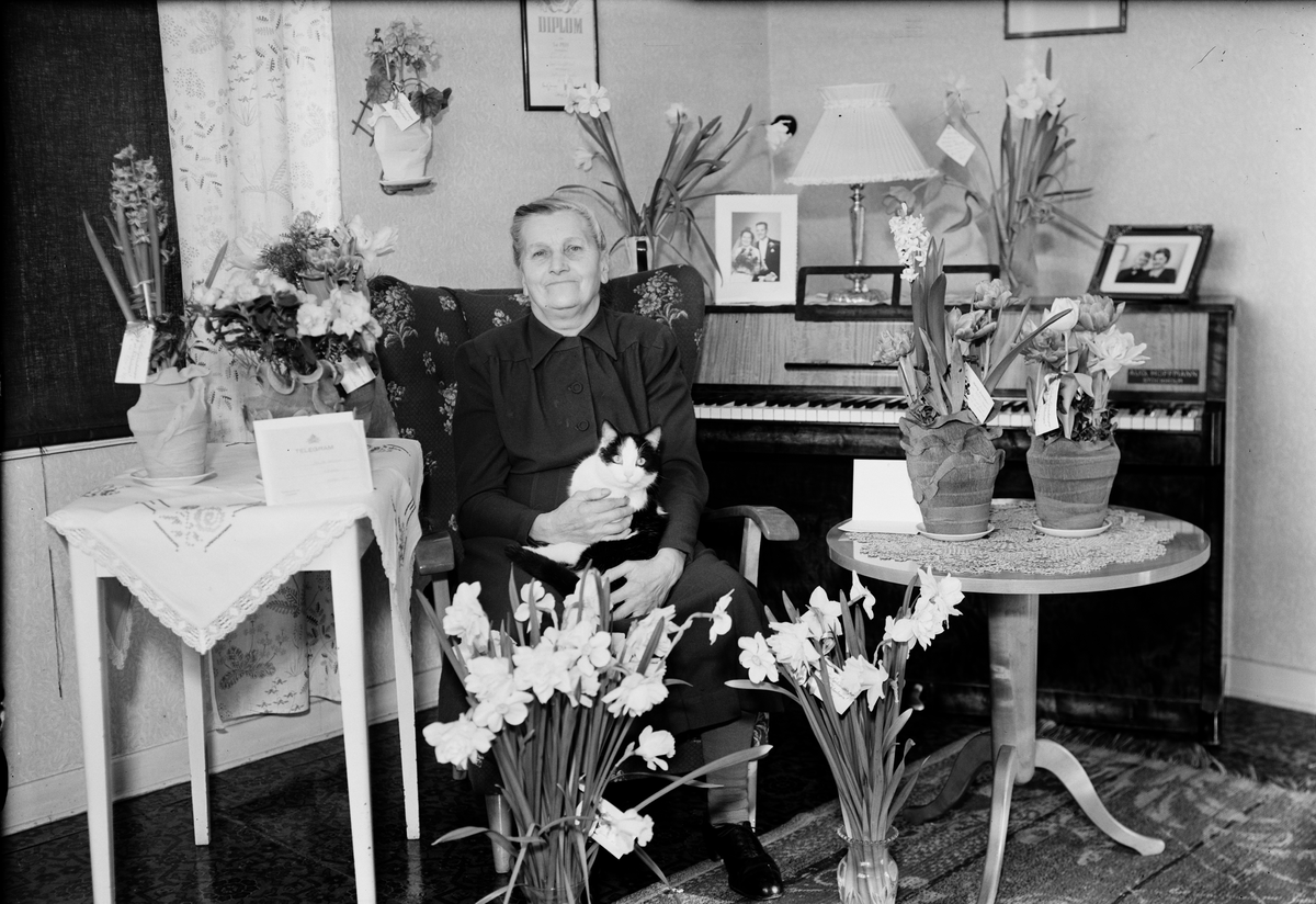 Titel: Kvinna i hemmet omgiven av blommor, Upplands-Tuna, Tuna socken, Uppland, 1952