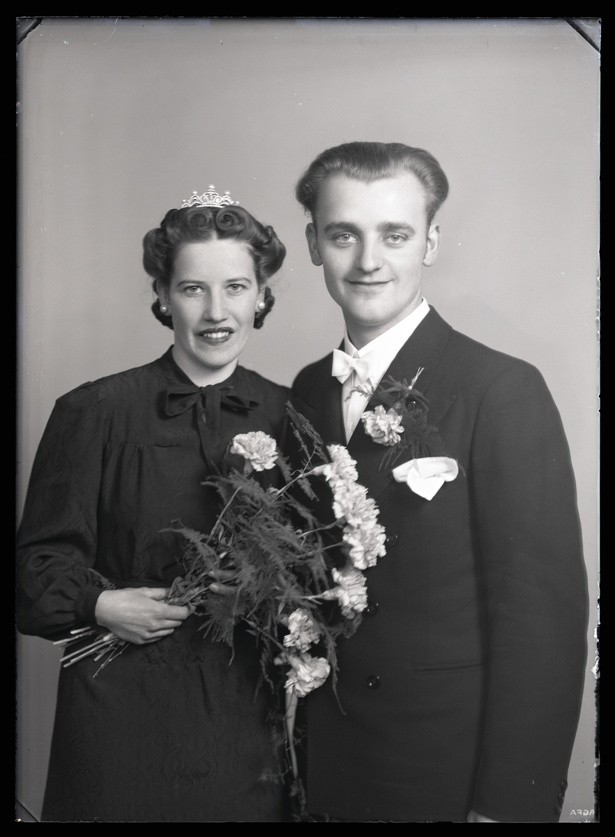 Titel: Bröllopsporträtt, brudpar, Vanloo Pettersson, Lyckhem, Sörstafors. Ur Gustaf Åhmans samling.