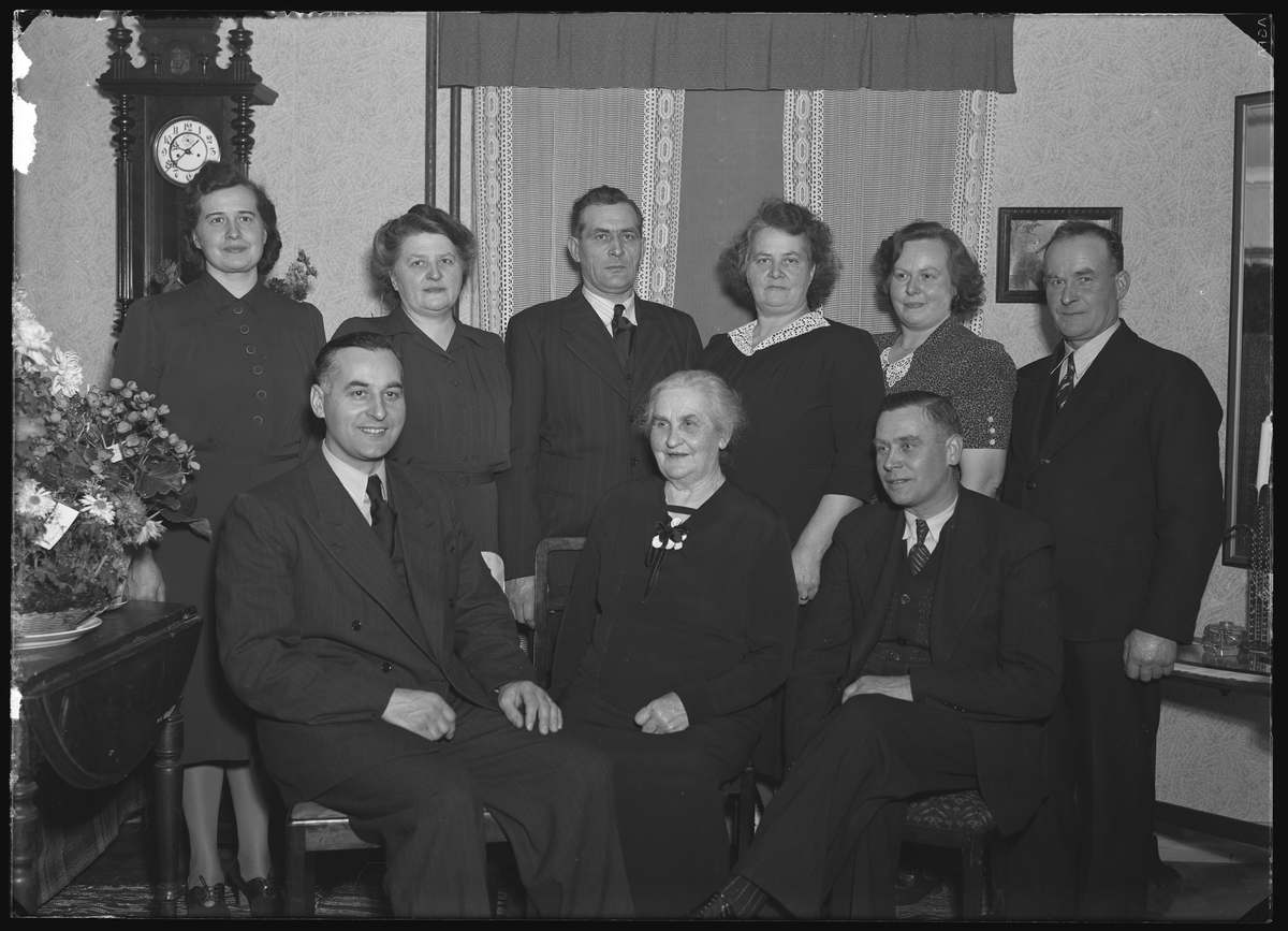 Grupporträtt, nio personer. Fru Hanna Pettersson. Ur Gustaf Åhmans samling.