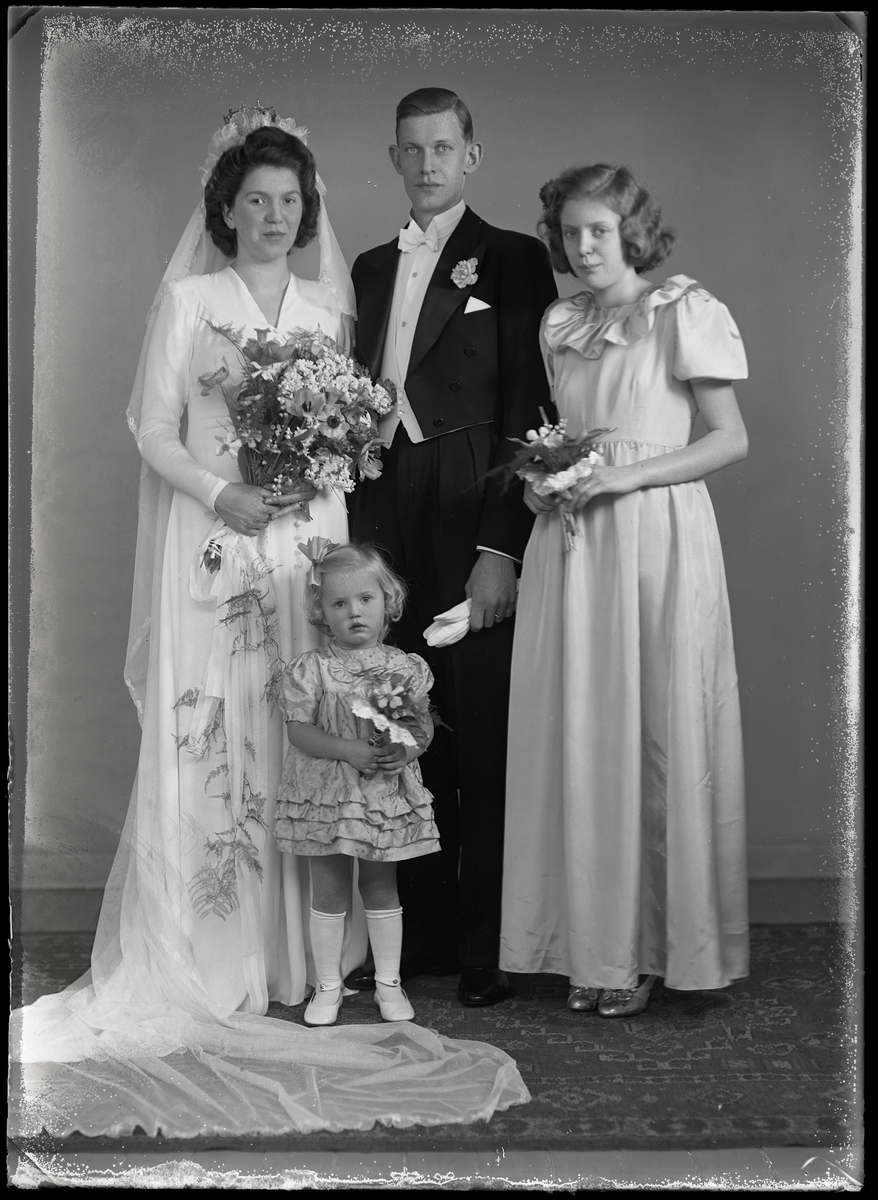 Grupporträtt, bröllop, fyra personer. Sven Jansson, Kästadalsvägen 11, Huddinge.