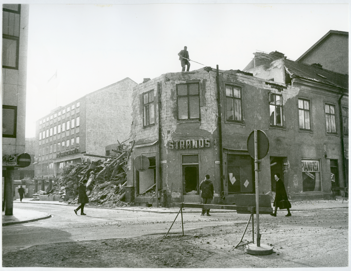 Rivningsarbete. Hantverkargatan mot väster, från Vasagatan. 1966.