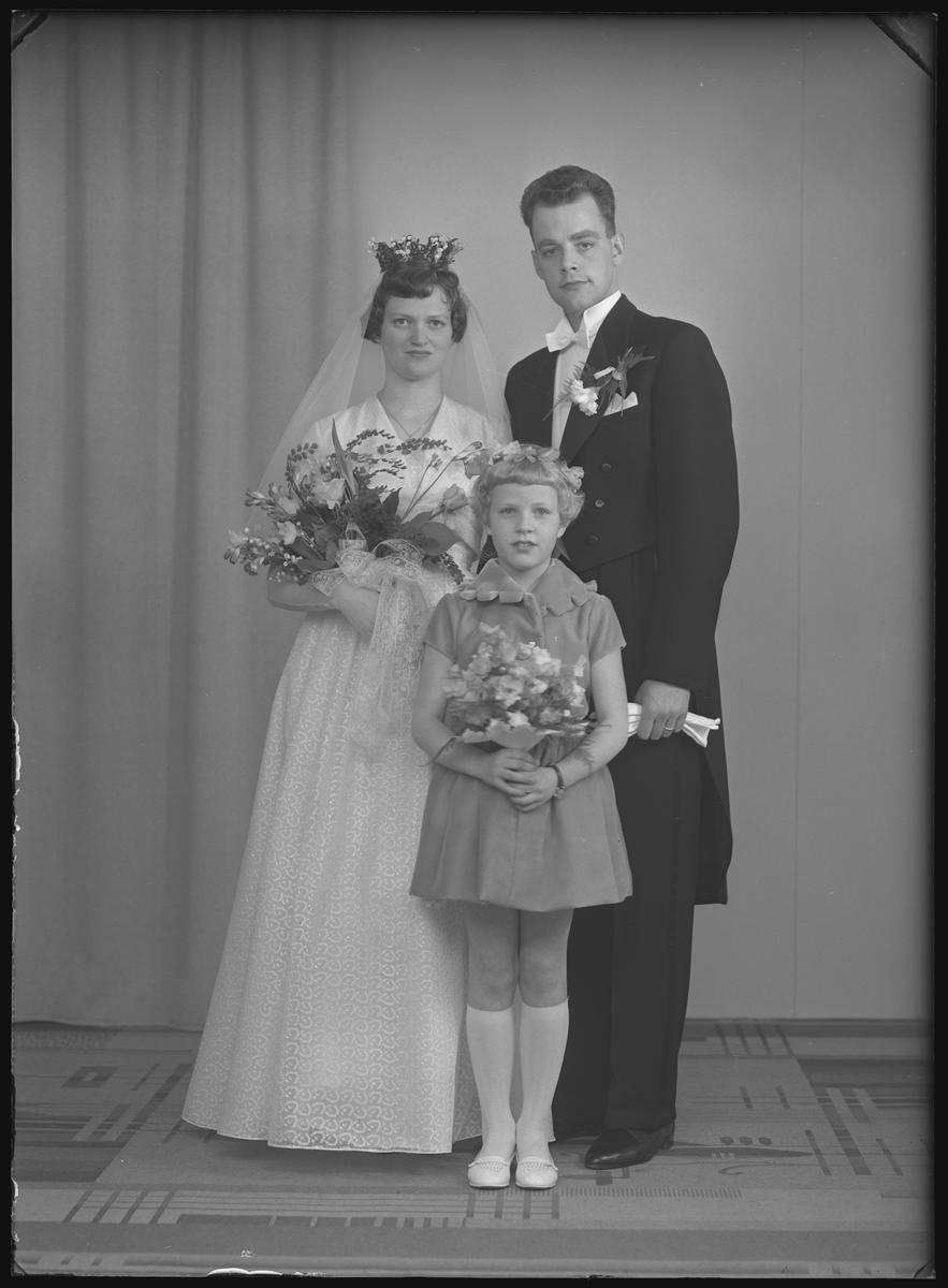 Grupporträtt-Brudpar. Kvist, Sergeant Villiam, Strömsholm. Ur Gustaf Åhmans samling.