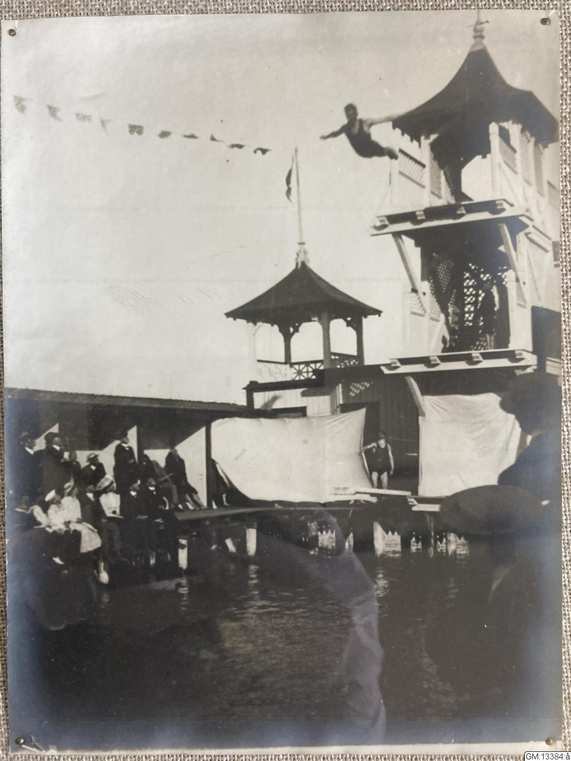 Beskrivning: 2 st glasade tavlor med monterade foografier föreställande simmning och bad