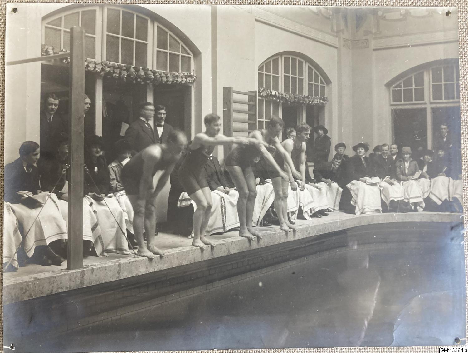 2 st glasade tavlor med monterade foografier föreställande simmning och bad