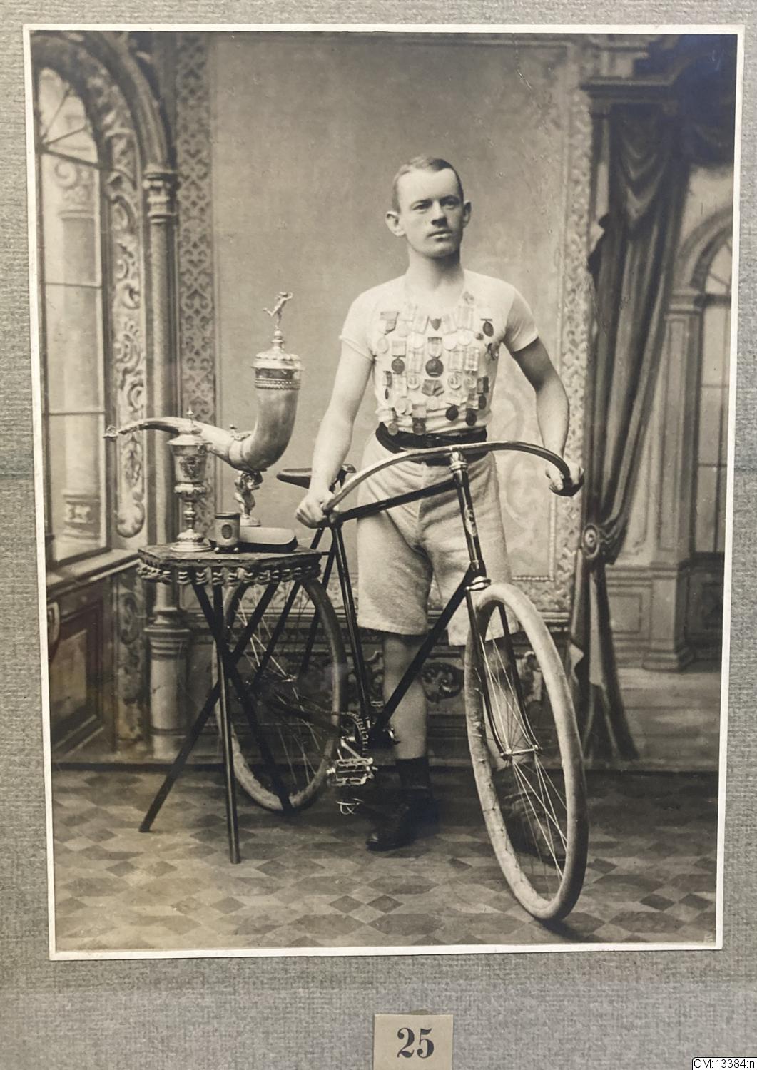 3 st fotografier på cyklister poserande i fotostudio och två teckningar föreställande olika cykeltyper, monterade i en ram.