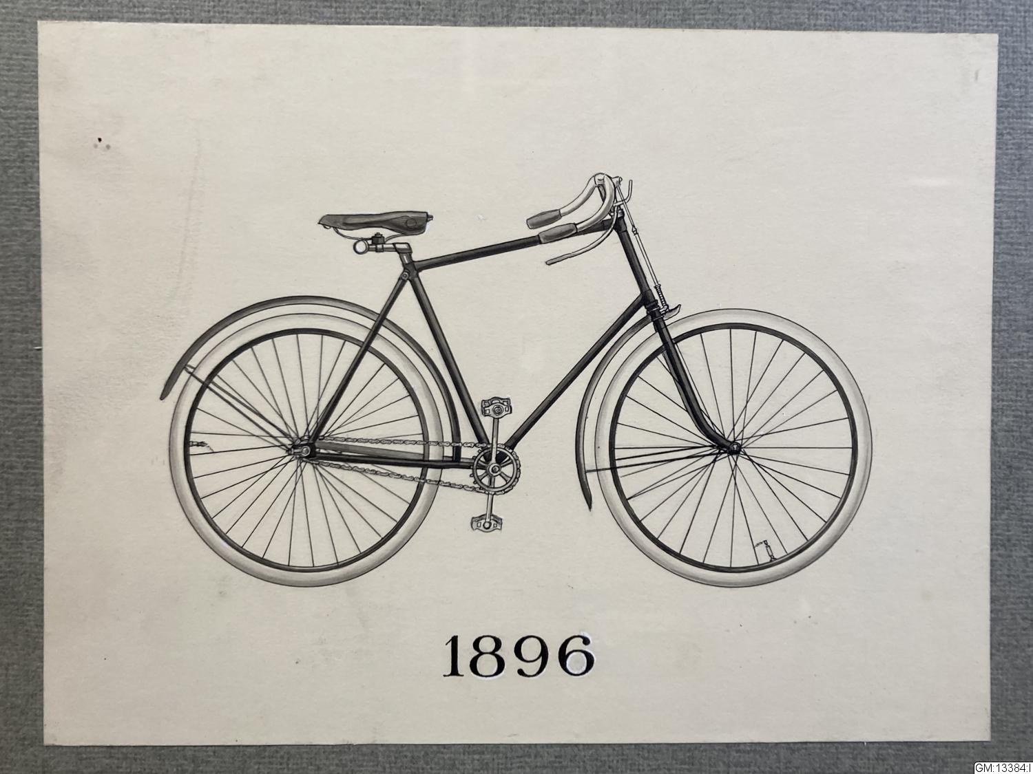 3 st fotografier på cyklister och två teckningar (av totalt 12 utställda) visande cykelns utveckling med årtal 1896 och 1923, monterade i en ram.