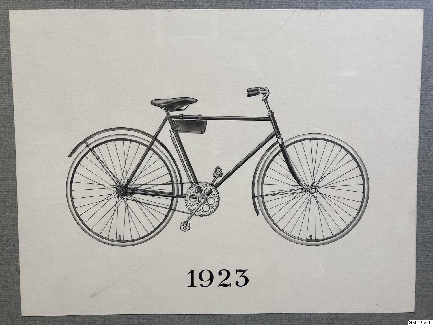 3 st fotografier på cyklister och två teckningar (av totalt 12 utställda) visande cykelns utveckling med årtal 1896 och 1923, monterade i en ram.