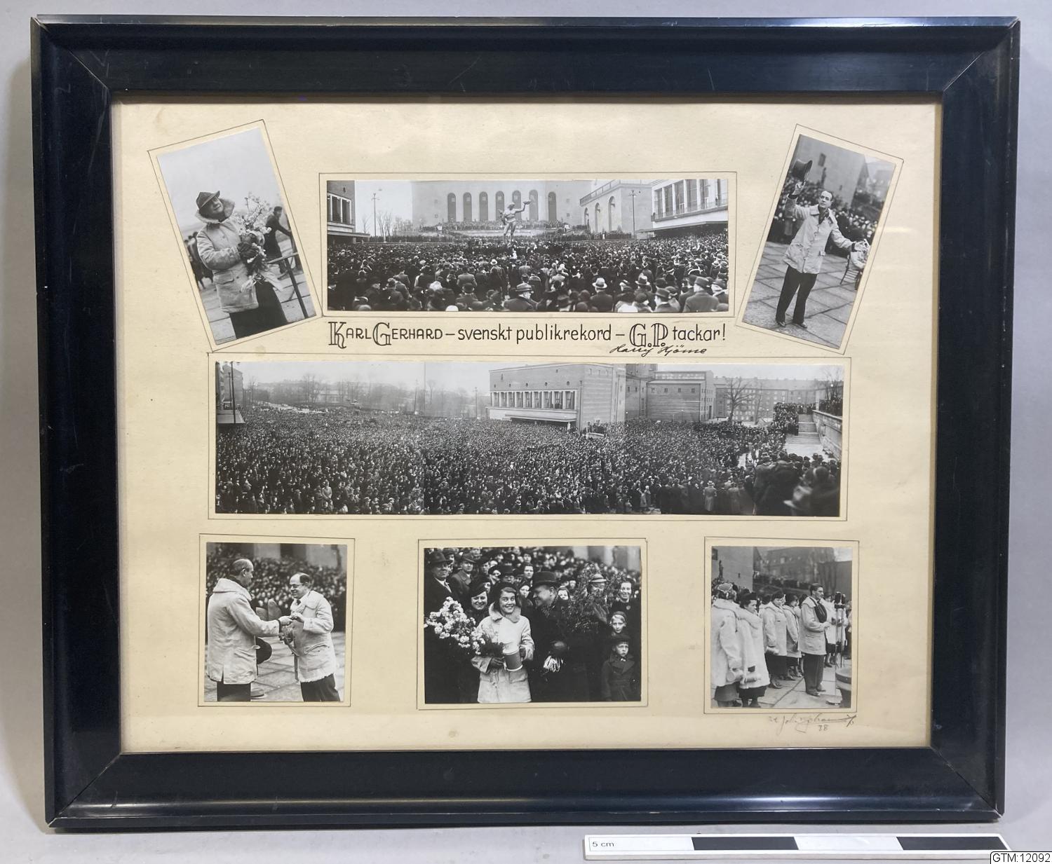 Minnestavla till minne av Karl Gerhards svenska publikrekord på Kungsportsavenyn/Götaplatsen. Fotokollaget består av sju fotografier.