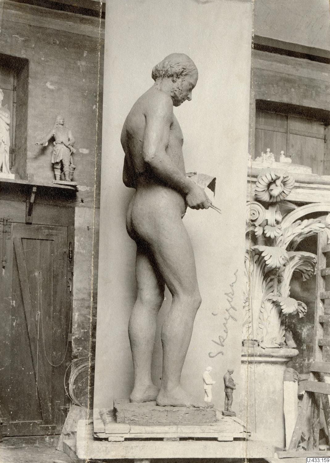Ett fotografi av John Ericsson statyn medan den modelleras utav Ingel Fallstedt. Han modellerade först John Ericsson naken innan han modellerade på kläderna.