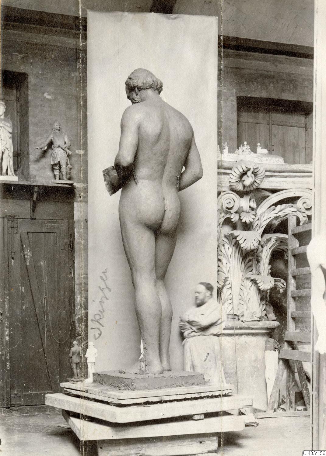 Ett fotografi av John Ericsson statyn medan den modelleras utav Ingel Fallstedt. Han modellerade först John Ericsson naken innan han modellerade på kläderna.