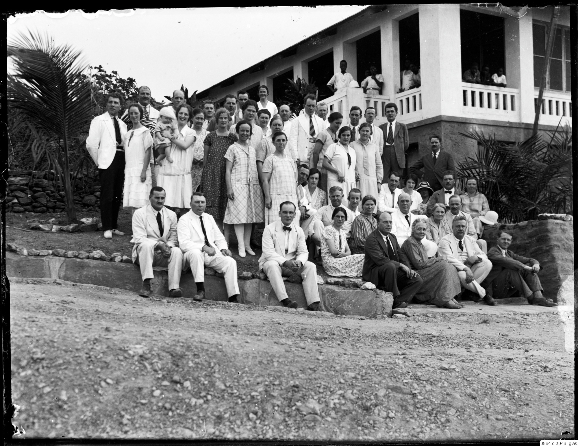 gruppbild, trappa, missionärer, byggnad, veranda, trädgård, fotografi, photograph