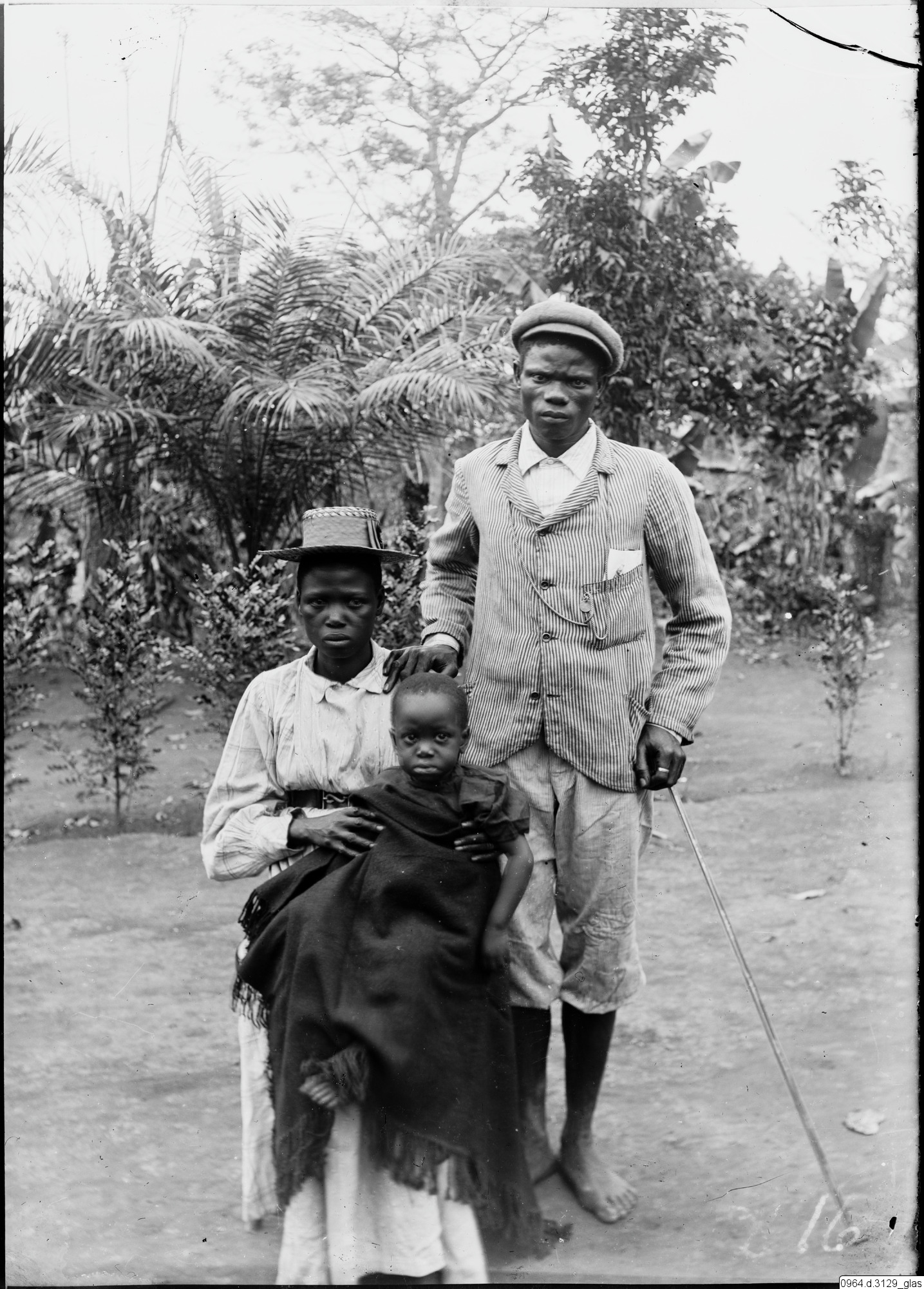 Familj, man med käpp och sittande kvinna med barn i famnen.