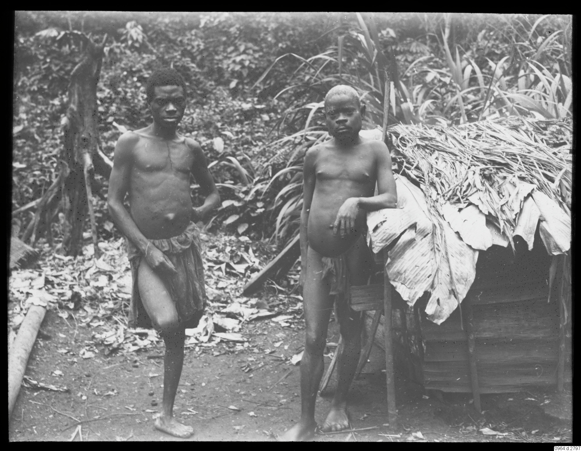 Två män fr. skogarnas folk utaför sin hydda.