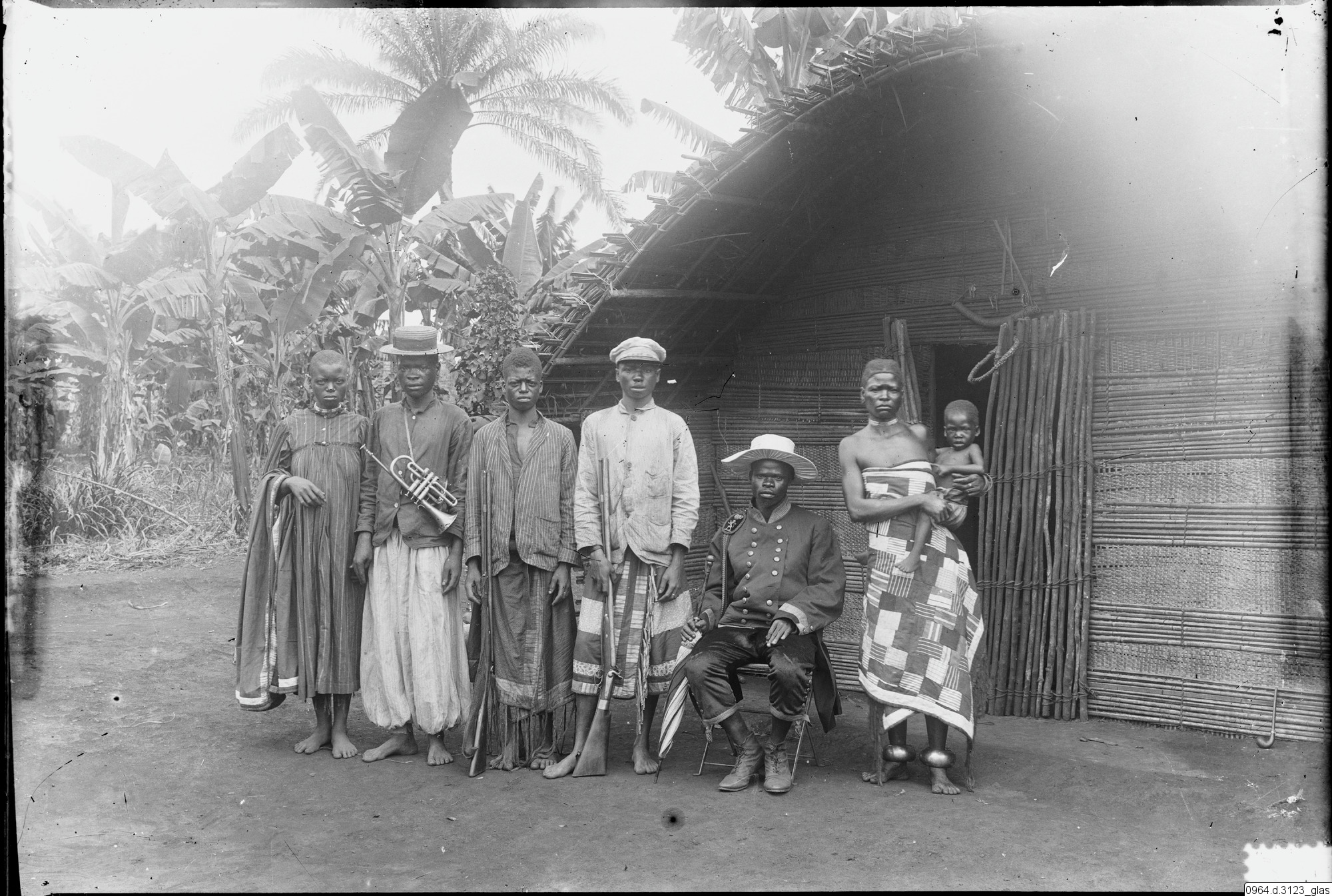 Gruppbild av kvinnor, barn och män framför hydda. Sittande man med uniform och paraply. Två män med gevär och och en man med trumpet.