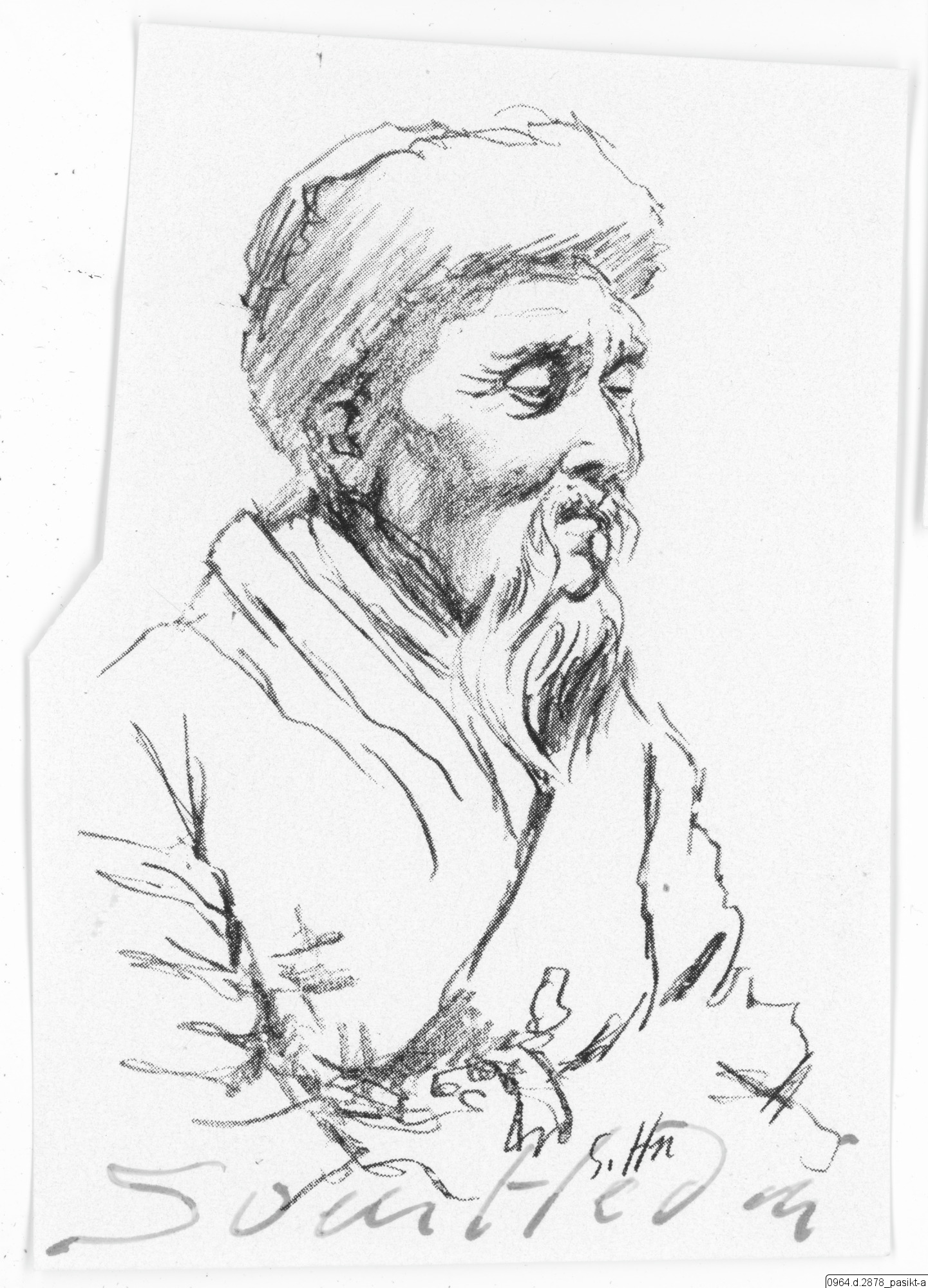 Tecknat porträtt av en man med skägg, av Sven Hedin.