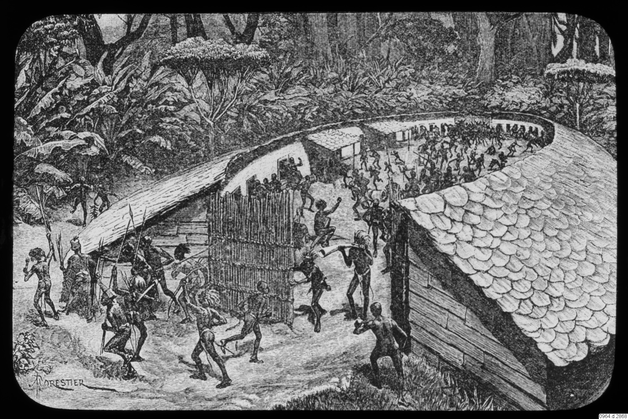 Fientligt anfall å ett bysamhälle i Öve Kongo.