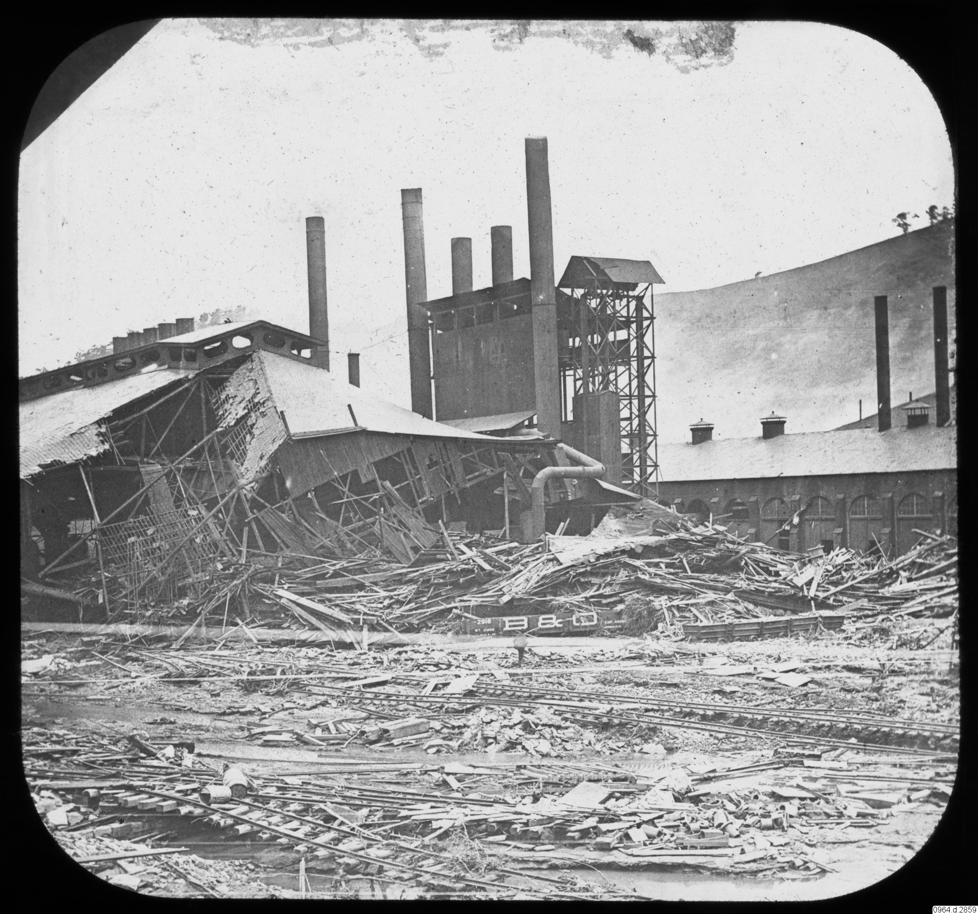 South Fork dammen brast,"Flood of Johnstown", 1889. Skadorna på Cambria Iron Works. Appalachian Plateau.
